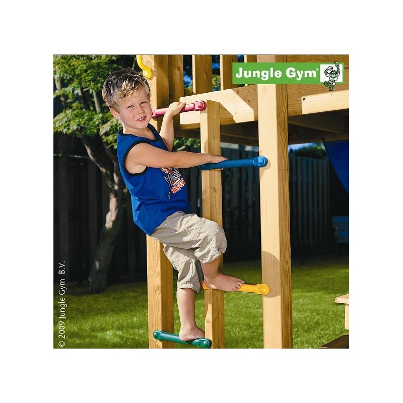 1 Step Module - žebřík je velmi oblíbeným rozšiřujícím prvkem dětských hřišť. Nejoblíbenější varianta je připojit přes vysunuté dřevěné ráhno na každou dětskou sestavu řady Jungle Gym jako provazový žebřík.