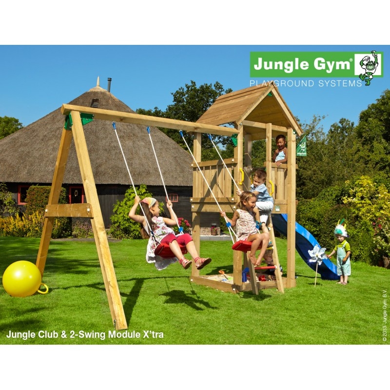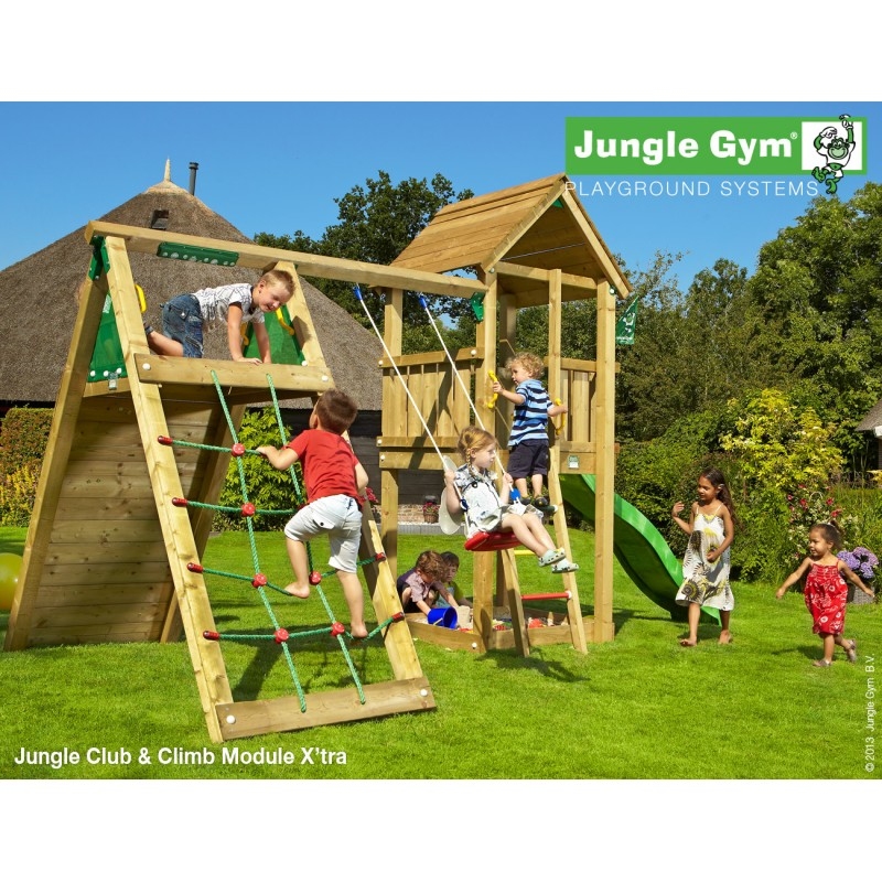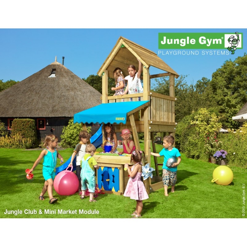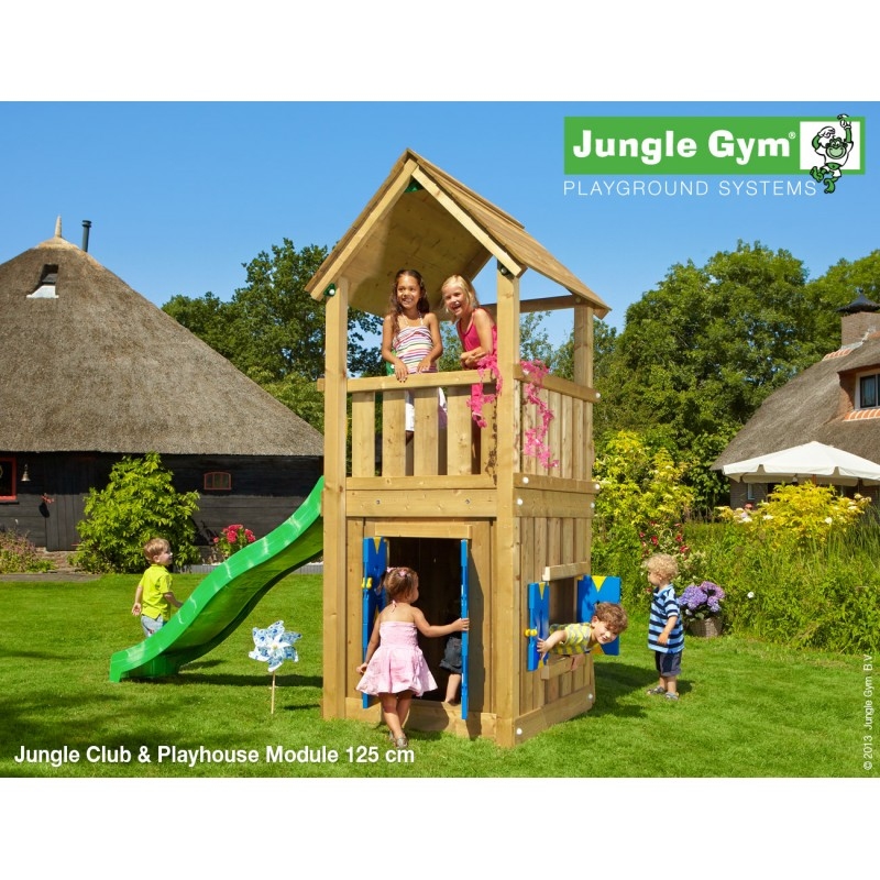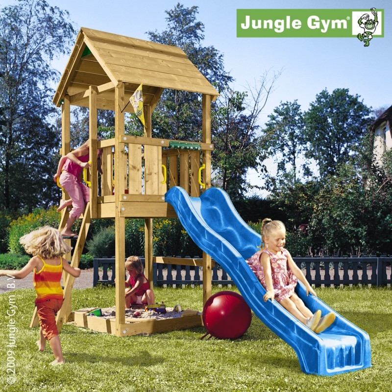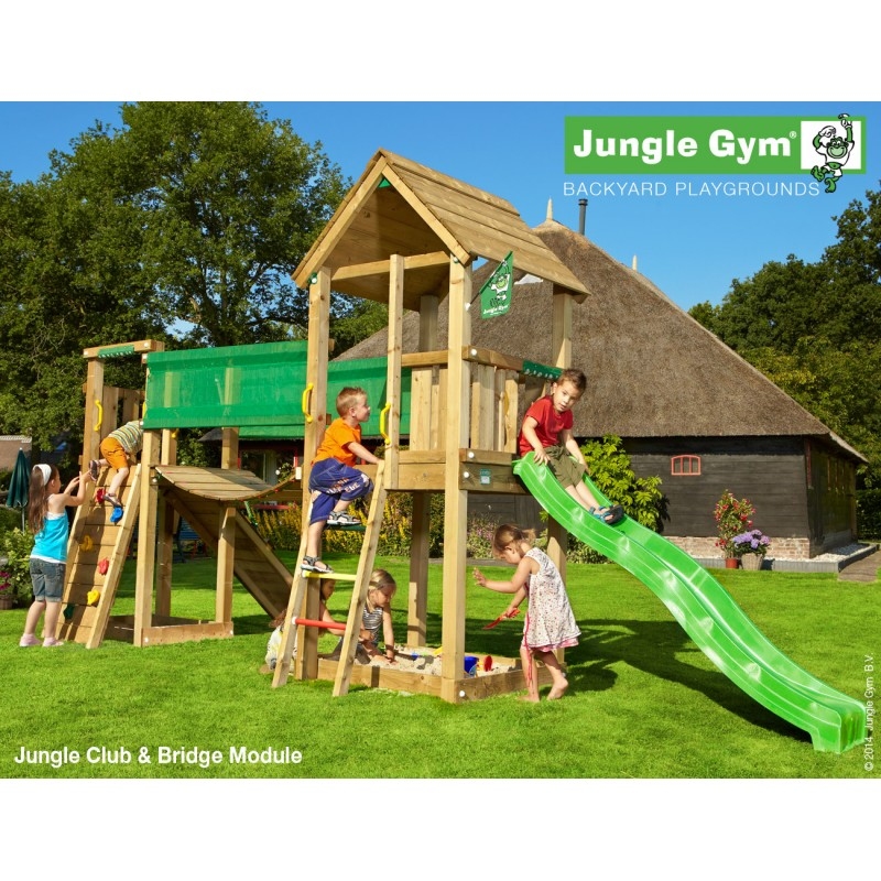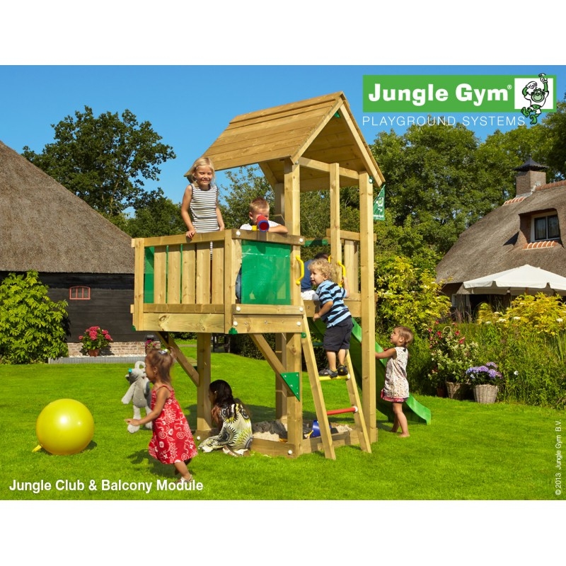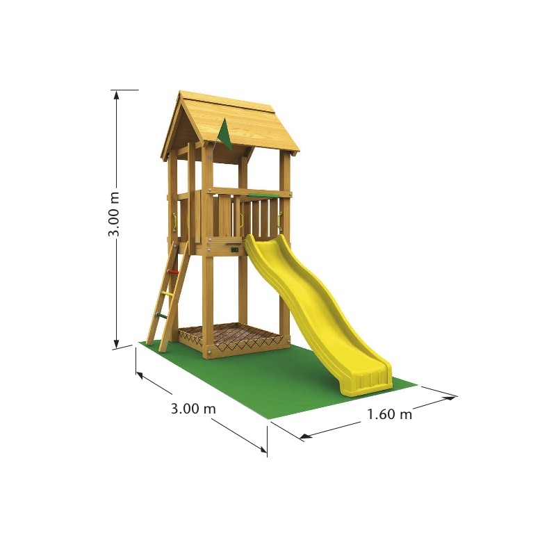 Dětské hřiště Jungle Gym Club je jedním z menších hřišť, tudíž hrací věž na Vaší zahradě nezabere příliš místa. Sestava má pevnou dřevěnou stříšku a podestu 110x80 cm, na kterou se děti dostanou pomocí žebříku a dolů se sklouznou po skluzavce. Pro tento typ doporučujeme skluzavku o délce 2,2 metrů, jejíž nástupní výška je 1,25 metrů. Nabídnout Vám můžeme žlutou, červenou, zelenou, fialovou či modrou. Barvu si prosím vyberte v nabídce variant. V základním vybavení je síť proti kočkám Cat Stop. Ve spodní části hrací věže se nachází prostor pro dětské pískoviště.