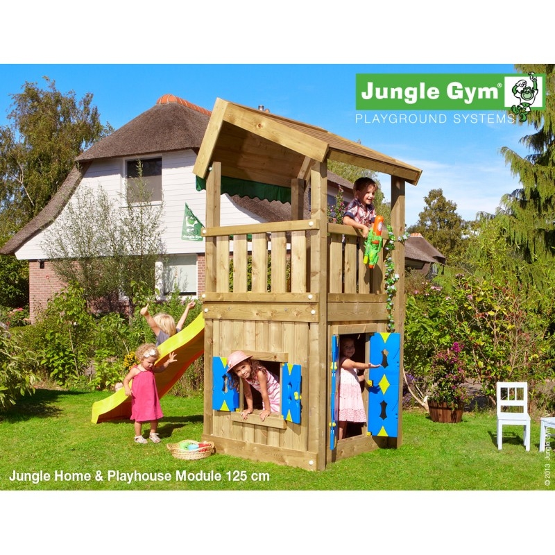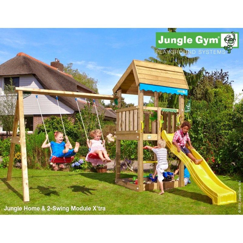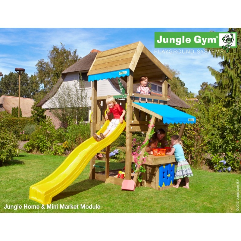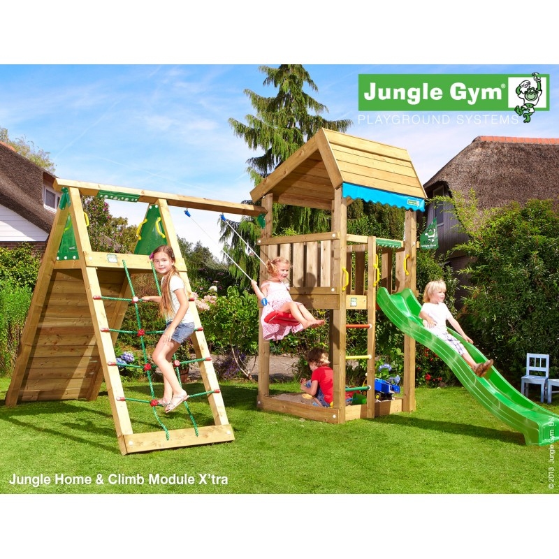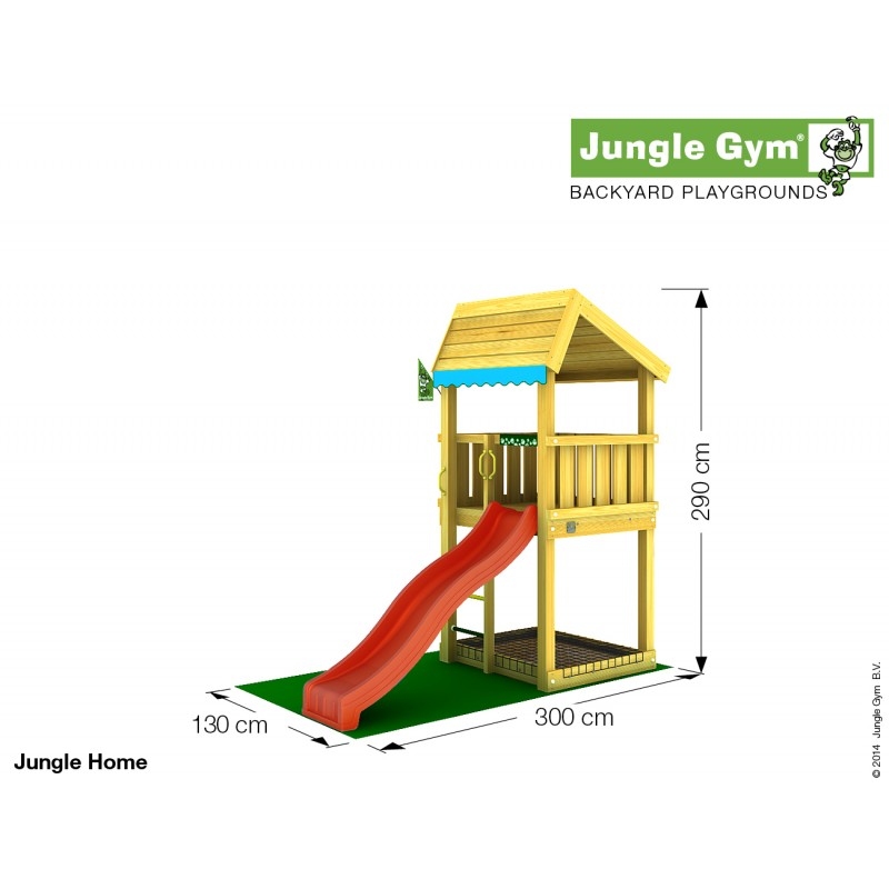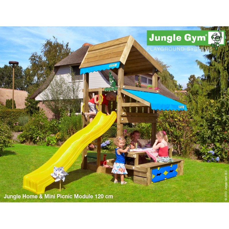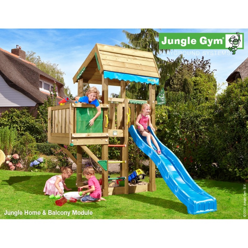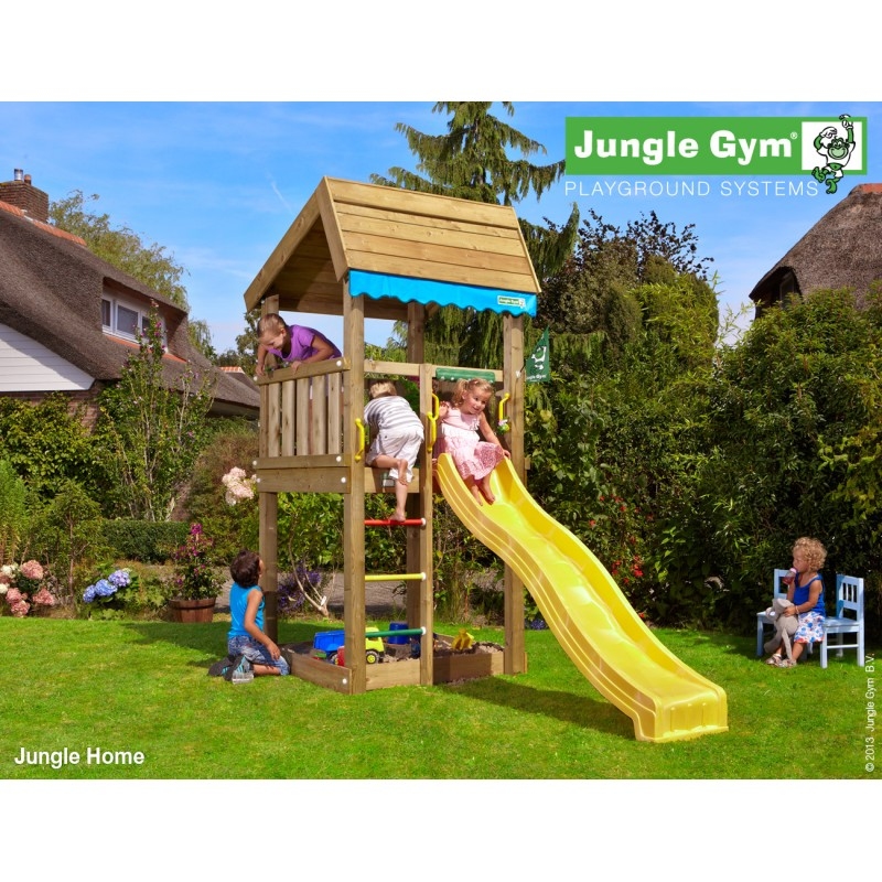 Dětské hřiště Jungle Gym Home je jedním z menších hřišť, nástupní žebřík je umístěn vedle skluzavky a tak má věž zbývající strany volné pro přidání více modolů, nebo je hřiště vhodné do malých zahrad. Sestava má zajímavou dřevěnou stříšku opatřenou plachtovou vlnkou a podestu 90x120cm. Pro tento typ doporučujeme skluzavku o délce 2,2 metrů, jejíž nástupní výška je 1,25 metrů. Nabídnout Vám můžeme žlutou, červenou, zelenou, fialovou či modrou. Barvu si prosím vyberte v nabídce variant. V základním vybavení je síť proti kočkám Cat Stop. Ve spodní části hrací věže se nachází prostor pro dětské pískoviště.