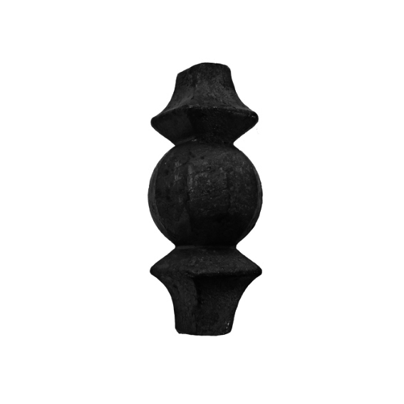Kovaný prvek, část kované tyče, výška 90mm, průměr kuličky 35mm, na tyč 14x14mm. Vhodné na výrobu tyčí atypické délky, na výrobu různých kovaných elementů, ornamentů, na ozdobení výplně plotu, brány, branky mříže, zábradlí ..